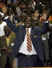 Orange Democratic Movement (ODM) presidential hopeful Raila Odinga salutes surpporters after he was nominated to run for the presidency on the party's ticket, during the party's national delegation conference at the Moi International Sports complex in Nairobi.